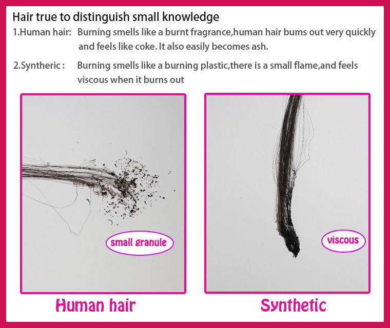 Human hair will be ash , which will go away after pinching and smell foul . When burning , the human hair will show white smoke,while synthetic hair will be a sticky ball after burning and will show black smoke.